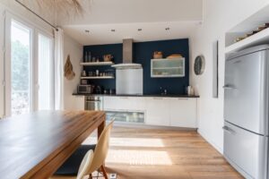Côté nuit, deux chambres à la décoration épurée invitent à la détente et au repos. Une cuisine bien optimisée, aux couleurs neutres et agréable à vivre propose un ensemble d’équipements électroménager (lave vaisselle, four, four micro-ondes, hotte aspirante…). Une salle de bains avec baignoire, un WC indépendant et une cave complètent le descriptif.