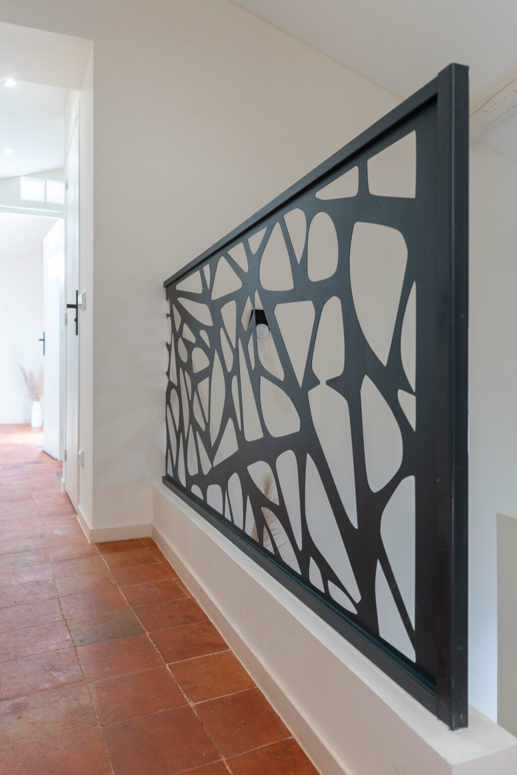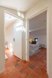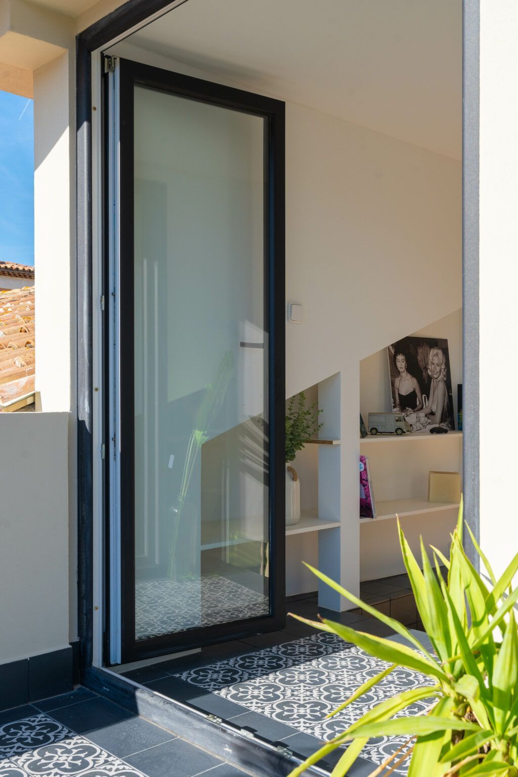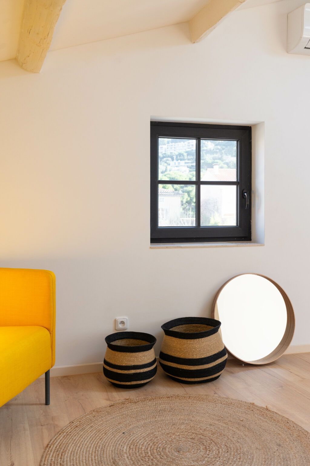 Agrémentée d’une lucarne démarquée par des jolis carreaux de ciment au sol, la connexion entre espace intérieur et extérieur est idoine.