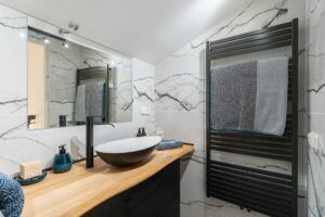 L’entrée se dessine directement selon les courbes d’un joli escalier en travertin nous menant vers un pallier, trait d’union entre espace de vie et espace de nuit.