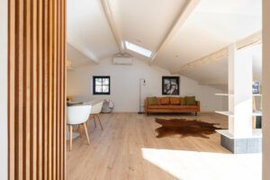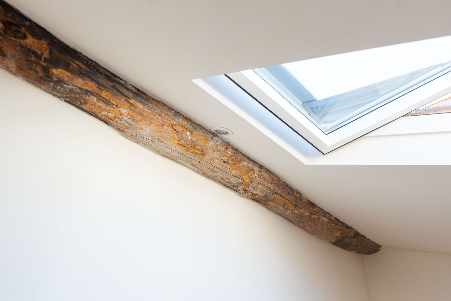 L’espace est ouvert, volumineux. Le cachet des poutres, le choix des tons sont renforcés par la lumière du sud baignant cette pièce, où les ombres se reflètent sur les élèments d’architecture.