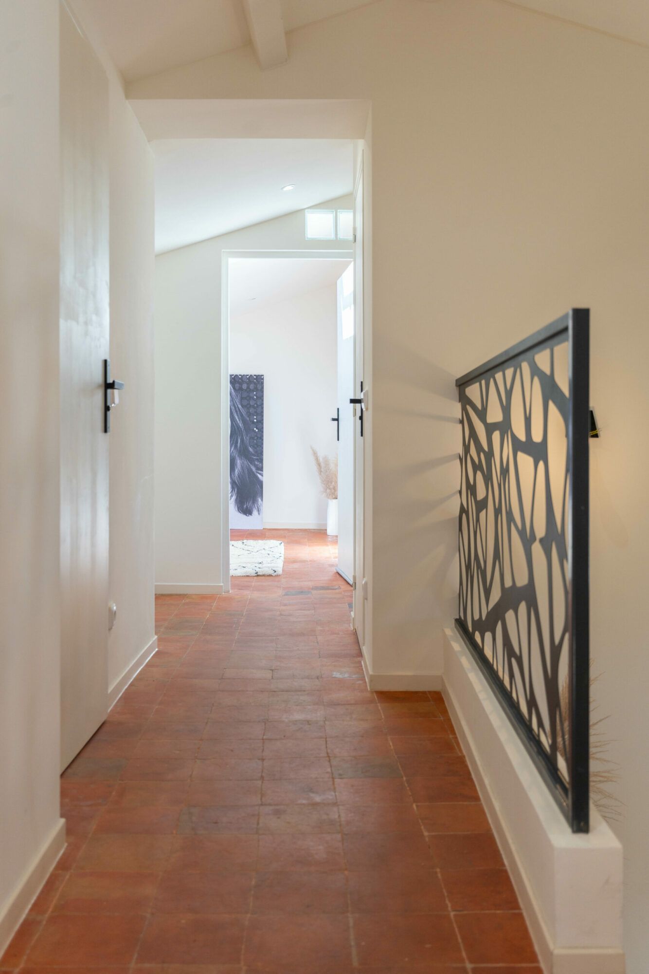L’entrée se dessine directement selon les courbes d’un joli escalier en travertin nous menant vers un pallier, trait d’union entre espace de vie et espace de nuit.