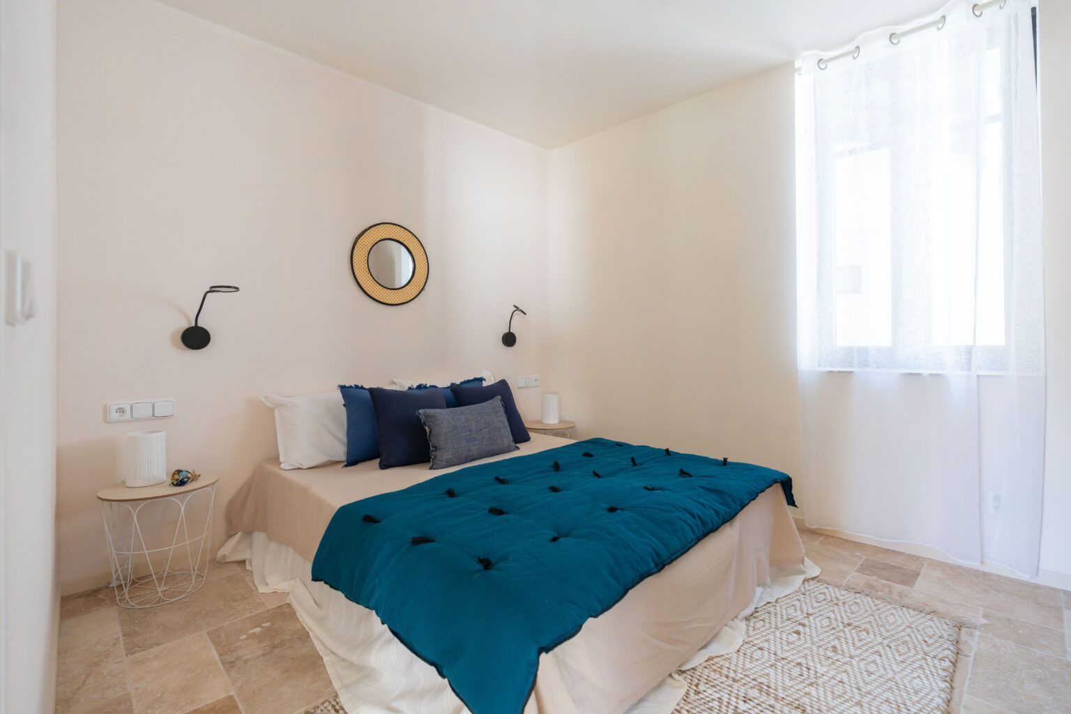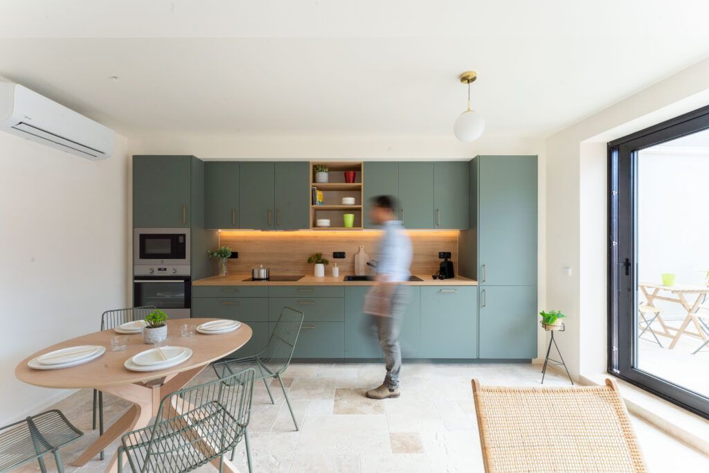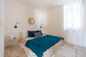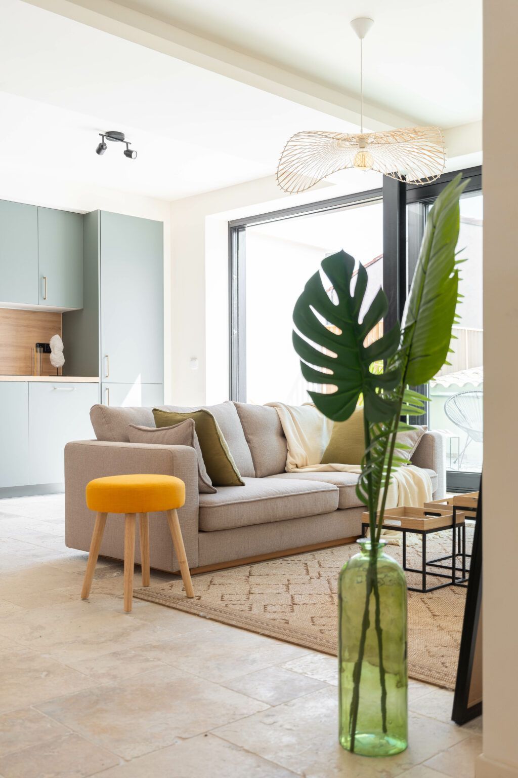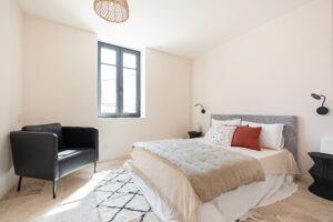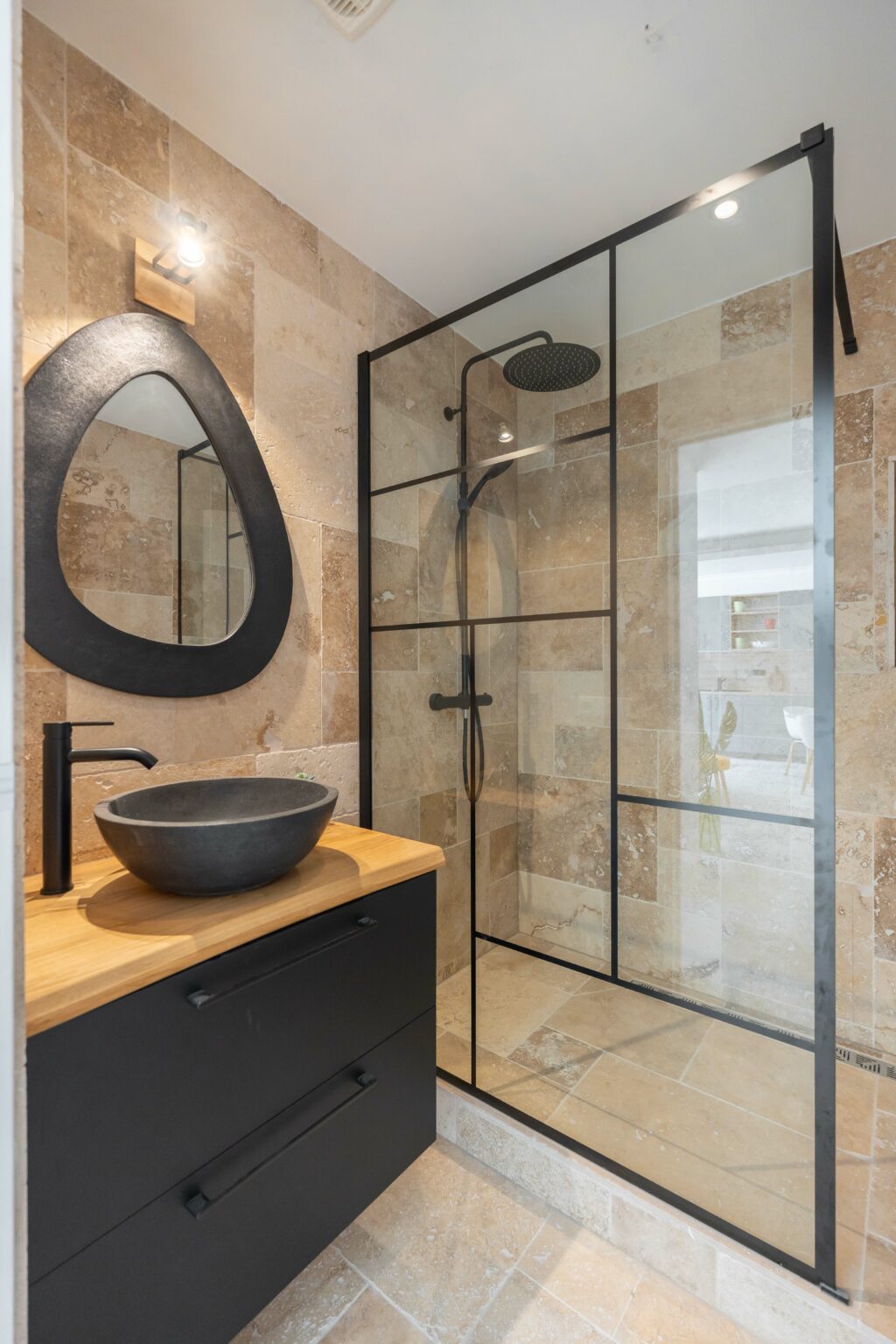 Les lignes douces, le choix des matériaux haut de gamme (travertin au sol, pierre apparente…) et les tons clairs rehaussés par des touches pastel mettent en valeur les éléments clés de décoration du bien.