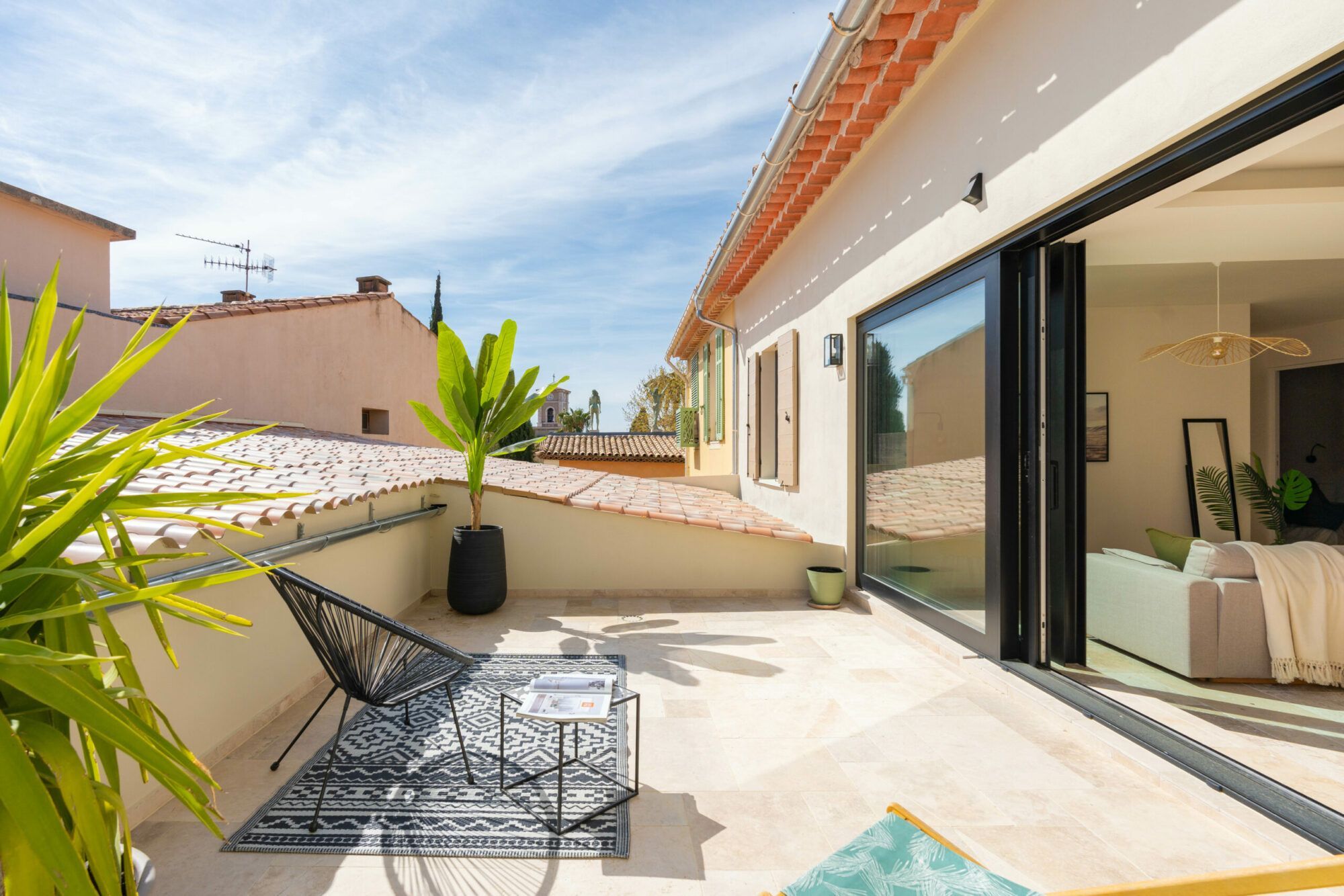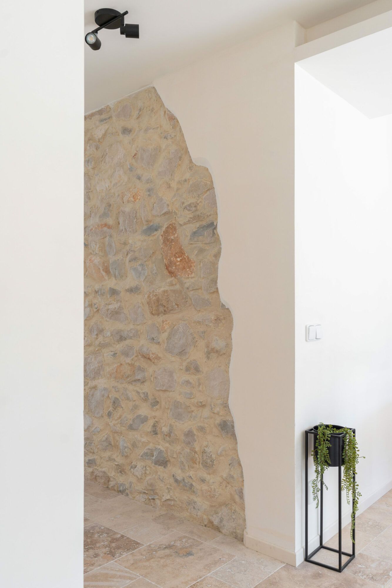 Les lignes douces, le choix des matériaux haut de gamme (travertin au sol, pierre apparente…) et les tons clairs rehaussés par des touches pastel mettent en valeur les éléments clés de décoration du bien.